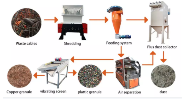 Automation copper wire recycling machine is a professional dry separation of waste wire and cable production line. Highseparation rate, one feeding , intepration structure .Al controlled by PLc, in the domestic leading level.just put the wires into theGranulator and through a process of chopping, vibration and Pulse dust collection system they will be automatically processedand separated into copper granules & plastic granules.