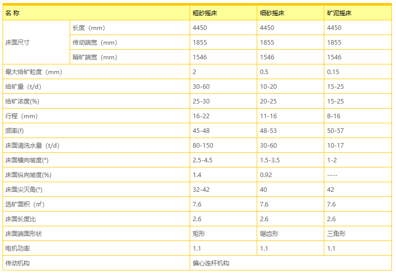 选矿摇床可以使矿粒按其密度和粒度不同而沿不同方向运动,并从给矿槽开始沿对角线呈扇形展开,依次沿床面的边沿排出,排矿线很长,能精确地产出多种质量不同的产物,如精矿、次精矿、中精矿和尾矿等。